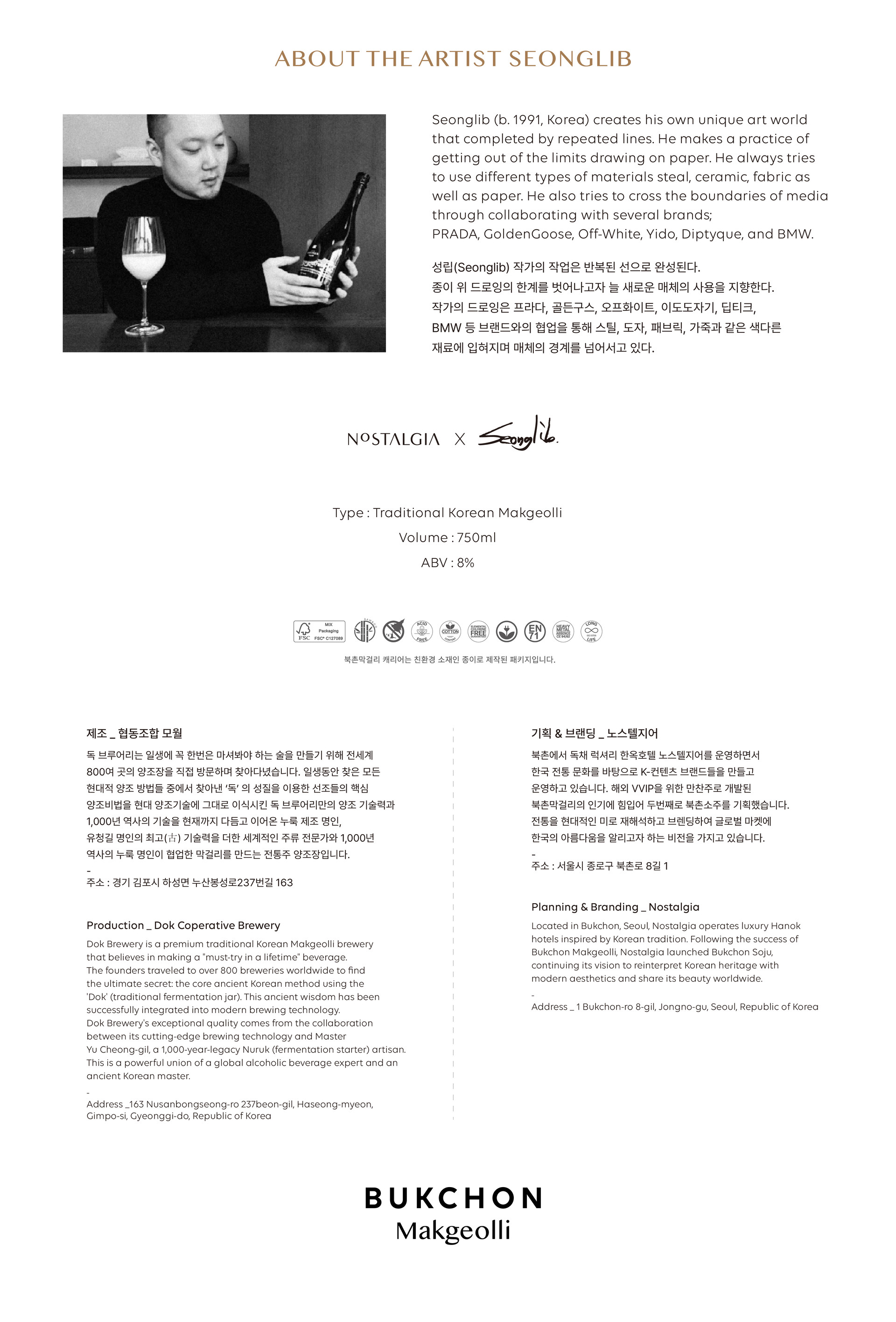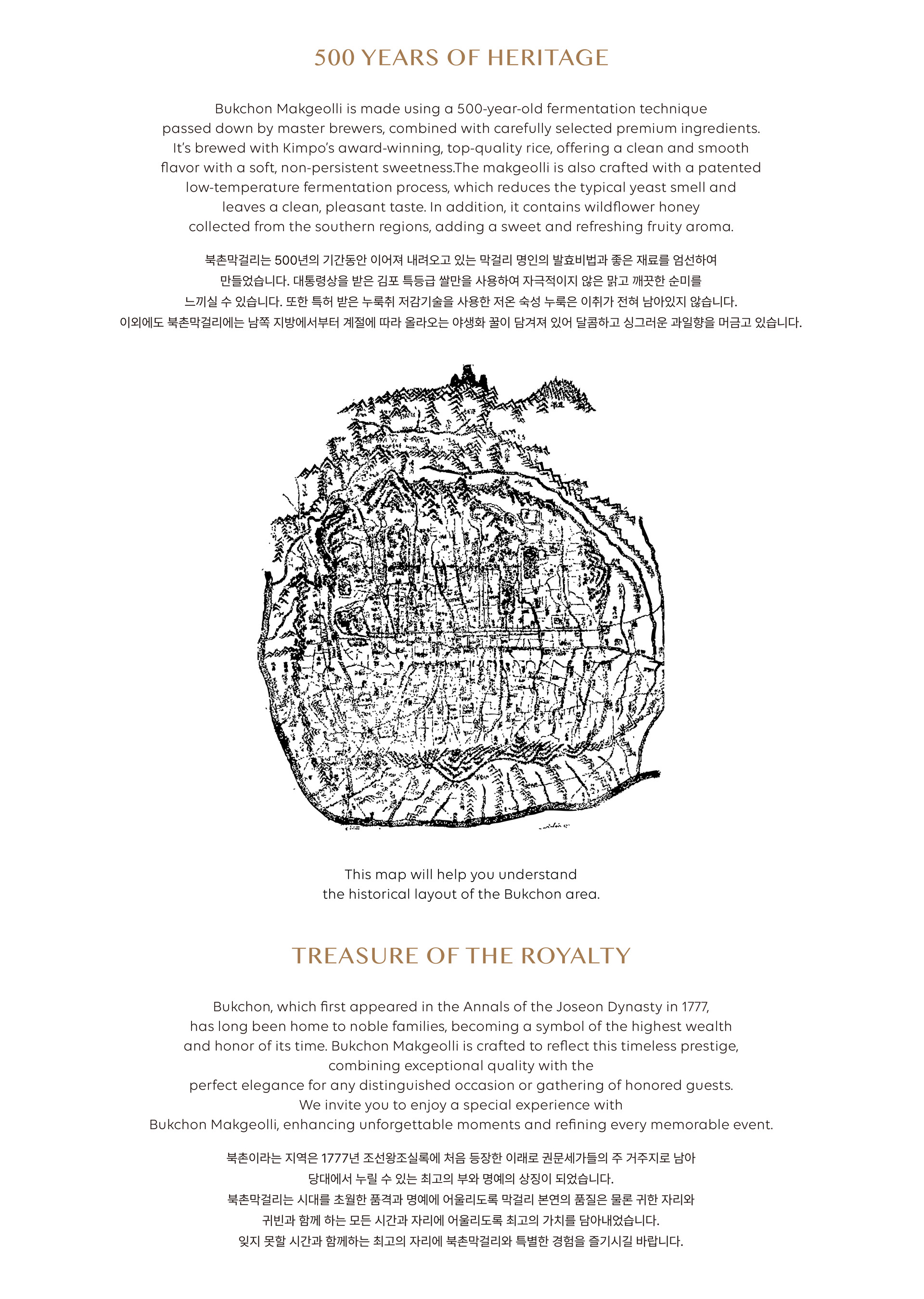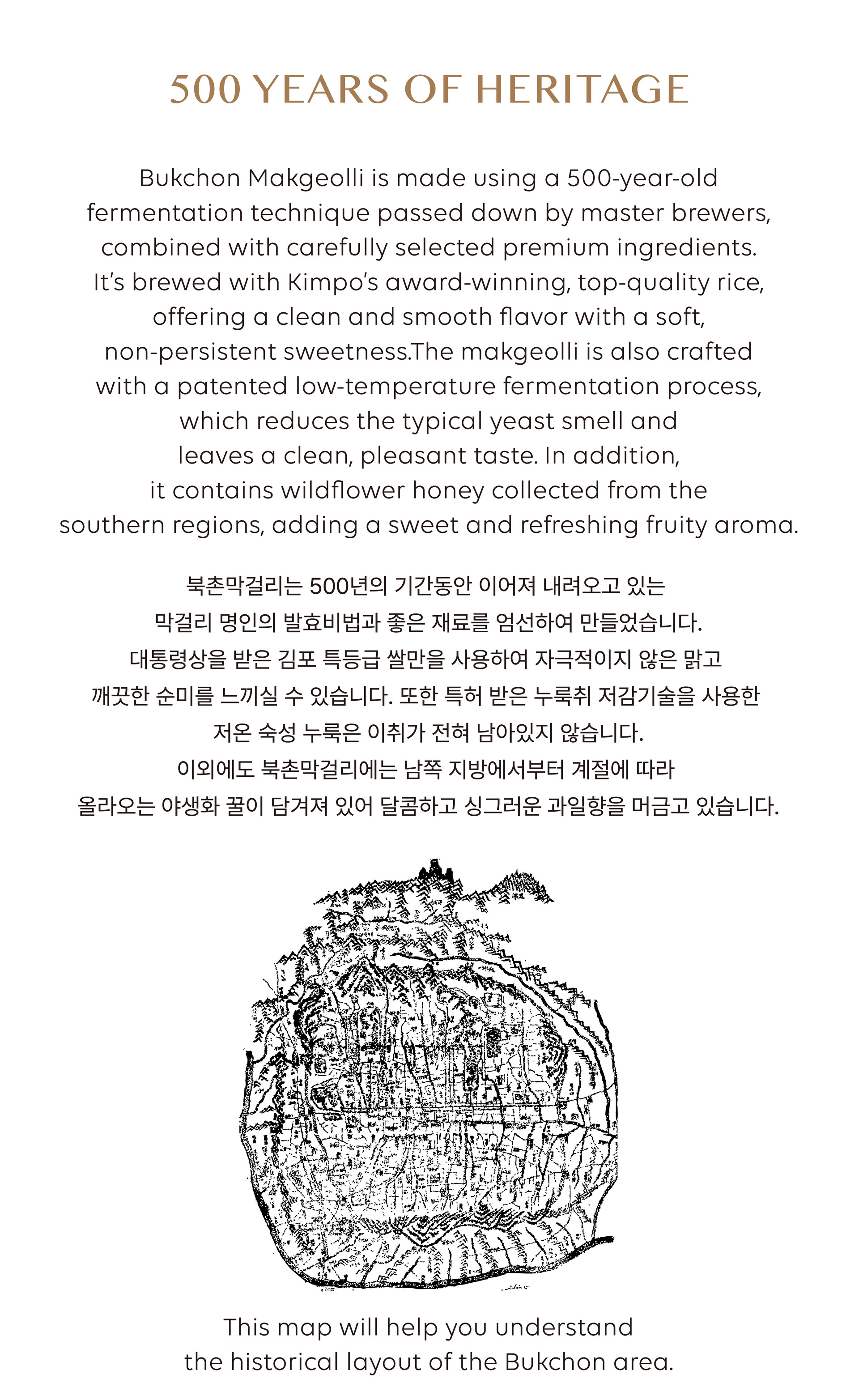 Bukchon Soju carries forward this spirit and philosophy-the Bukchon heritage-embodying their unyielding drive for innovation and challenge, and their vision to open new eras that would benefit the world.