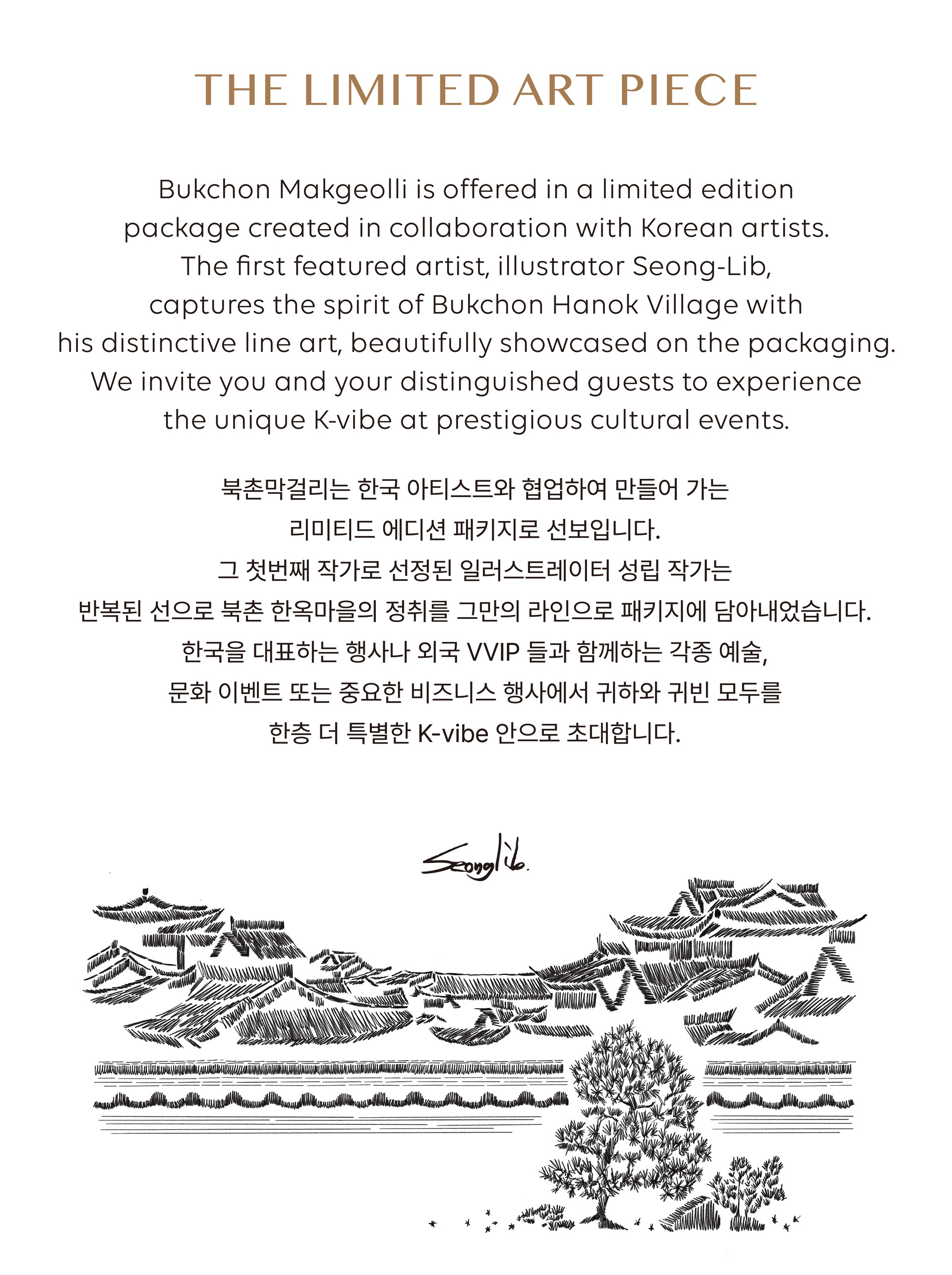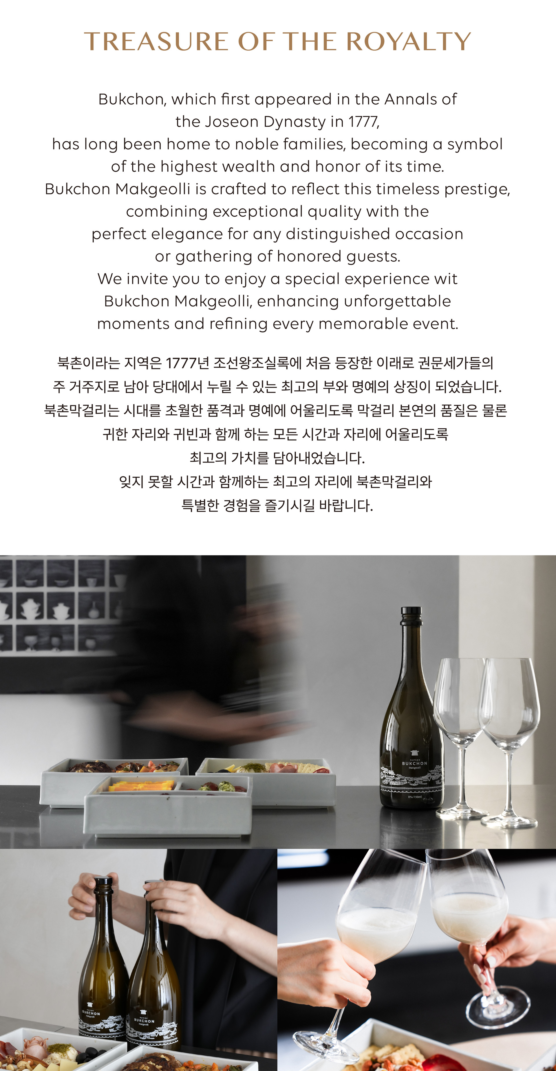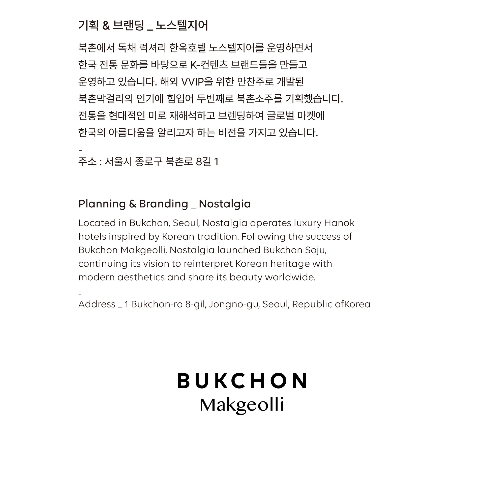 Bukchon Makgeolli is crafted to reflect this timeless prestige, combining exceptional quality with the perfect elegance for any distinguished occasion or gathering of honored guests.